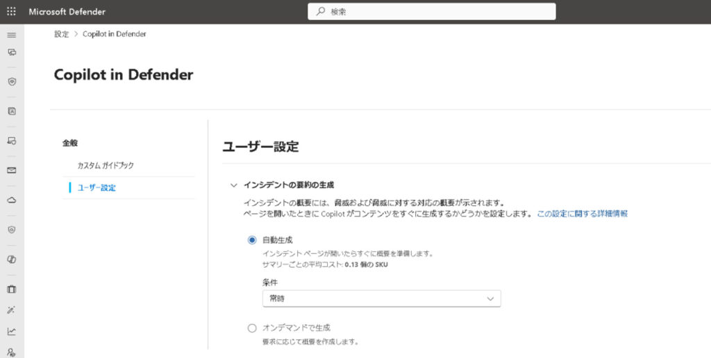 しかし、Security Copilotは既定の設定ではMicrosoft Defenderのインシデント画面を開くと自動でインシデントの要約や調査が始まります。自動実行による課金は予算計画を狂わせる原因となりますので、製品の設定から「オンデマンドで生成」に変更しておきましょう。