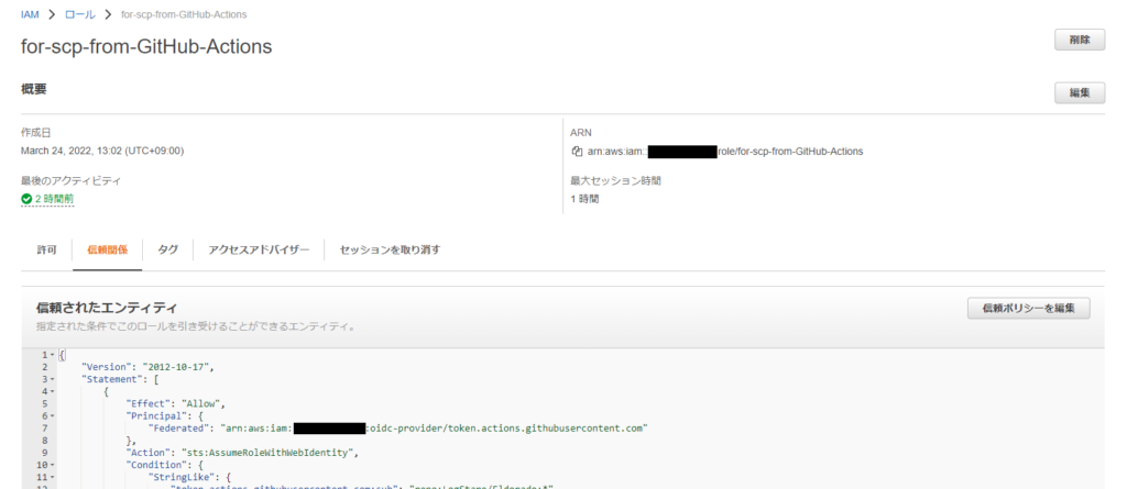 IAM > ロール > 作成したロールを選択、「信頼関係」タブを選択し「信頼ポリシーを編集」を選択します。